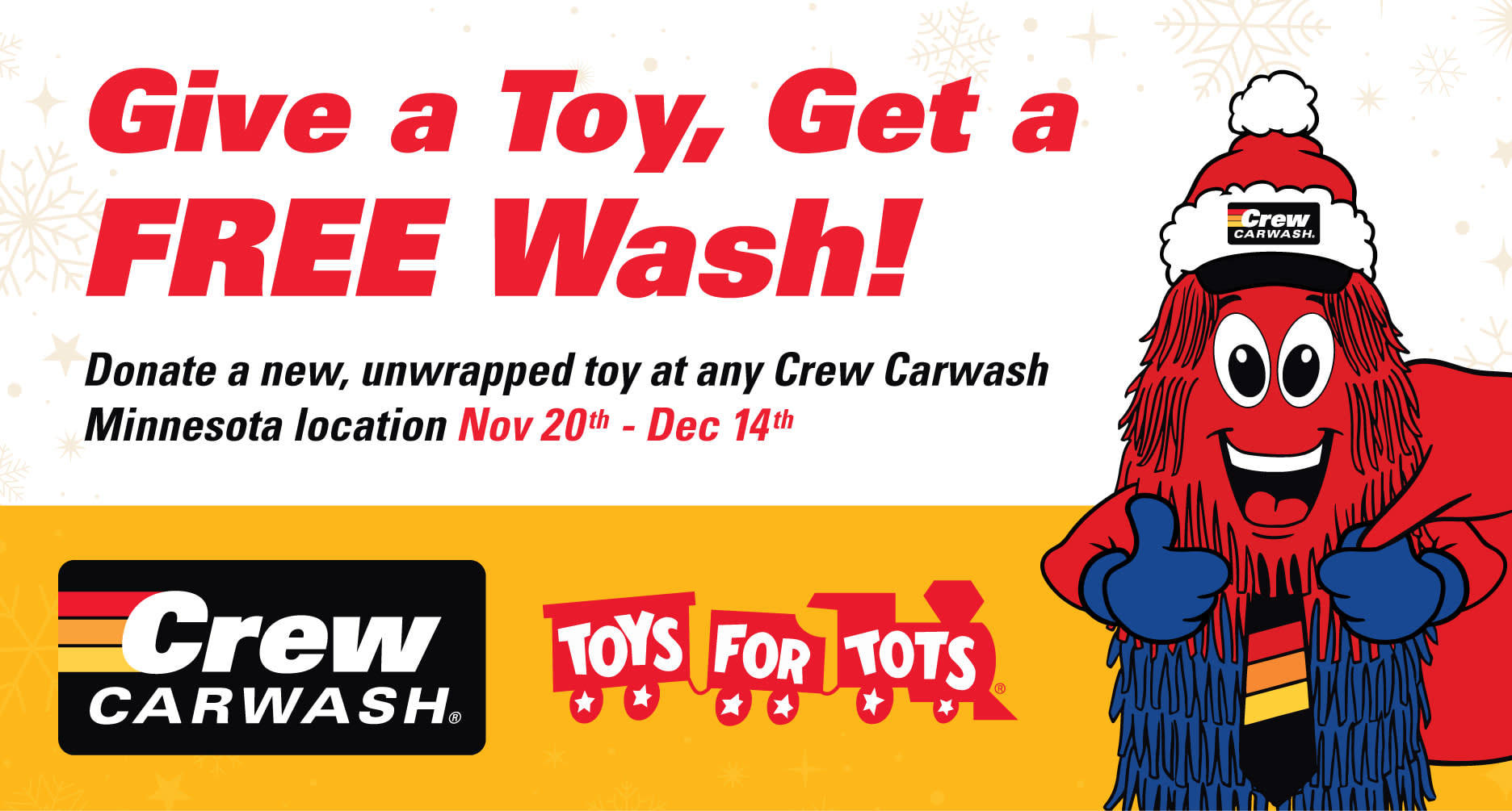Crew Carwash is excited to team up with Toys for Tots this holiday season at our Minnesota Crew locations! 🎁 From November 20–December 14, bring a new, unwrapped toy to any MN Crew Carwash listed below and receive a FREE wash as our way of saying thank you. Together, let’s spread joy and make a meaningful impact for children in our community! Wayzata | 1405 Wayzata Blvd Eden Prairie | 16345 Terrey Pine Dr Maple Grove | 13370 Grove Dr West St. Paul | 1949 South Robert St St. Cloud | 4118 Division St